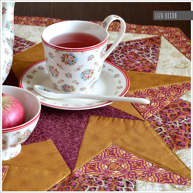 Patchworkový ubrus ve tvaru hexagonu. Použila jsem kolekci dovozových látek se zlatotiskem. Mám je moc ráda....jsou příjemné na omak, dobře se žehlí, jsou barevně stálé a mají svěží barvy. Ubrus je mírně vyztužen a prošit v konturách švů. Velikost strany 34 cm, šířka v kratším místě 58 cm, šířka od špičky ke špičce 66 cm.